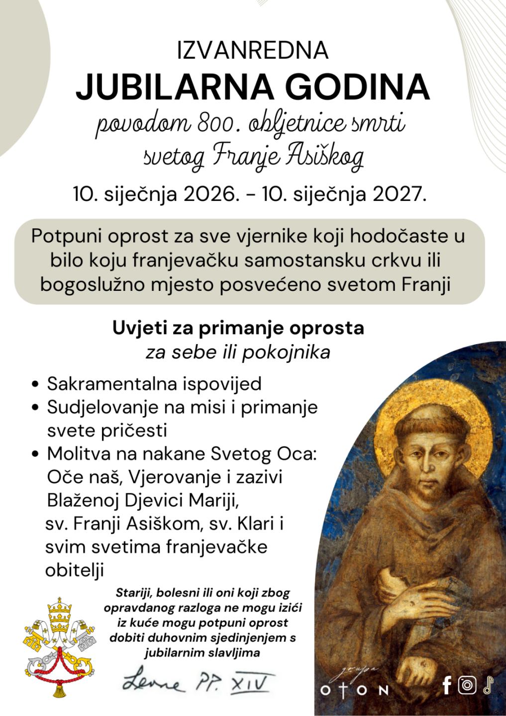 Povodom 800-te obljetnice smrti sv. Franje Asiškog papa Lav XIV otvorio je izvanrednu jubilarnu godinu koja traje od 10.1.2026. do 10.1.2027.